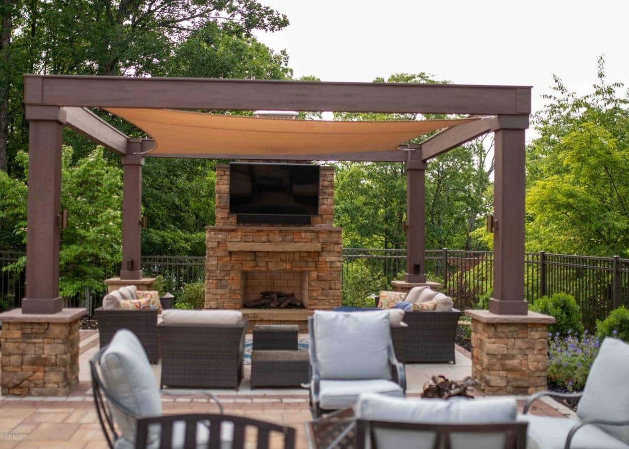 An outdoor fireplace is a beautiful statement piece that adds a touch of class to your patio and creates the feel of an inviting living room under the open sky. With mantle and stone/brick detailing, it frames the view, creates a natural backdrop for seating, and makes the whole space feel designed—not improvised. The taller structure blocks wind and reflects heat forward, so the lounge zone in front stays cozy well into the cooler seasons. It pairs seamlessly with pergolas, outdoor kitchens, and media (such as TVs or speakers with heat-aware placement), and offers plenty of customization options—including hearth depth, mantle style, and lighting.