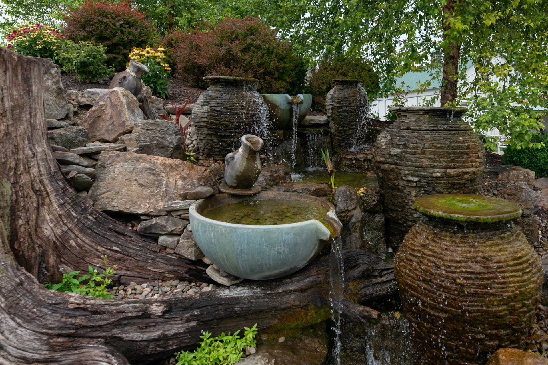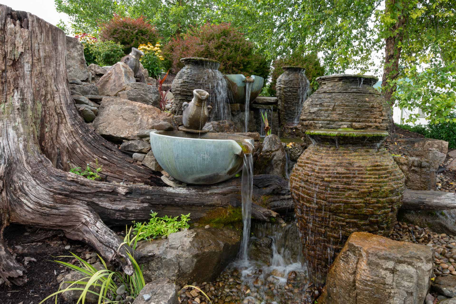 Our team installed a large water feature with stacked slate urns and copper bowls, creating beautiful movement and sound throughout the area. A winding stone pathway leads visitors around a pondless waterfall accented with natural mountain boulders and lush landscaping beds.